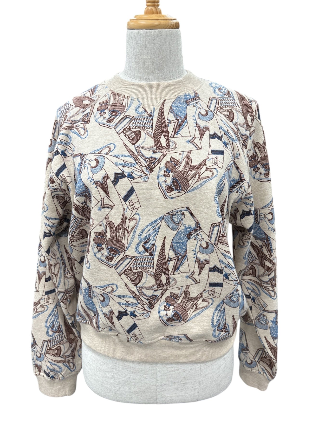 The long-sleeved patterned top features the brand's signature abstract art print, weaving together geometric and animal elements in blue and brown tones. The style is both artistic and highly recognizable, a hallmark of Hermès' visual language.